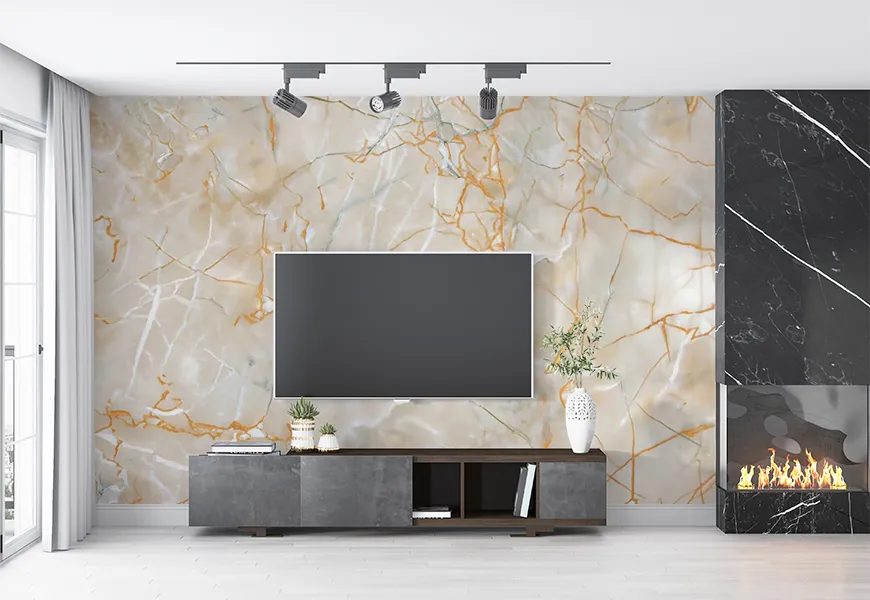 مرمر مات با رگههای ظریف، متالیکهای ساتن (برنز، گلد کمجلا) یا پتینۀ لوکس، کنار نور مخفی خطی و اکسسوریهای براق کنترل شده، پس زمینهای مجلل و چشمنواز میسازد.