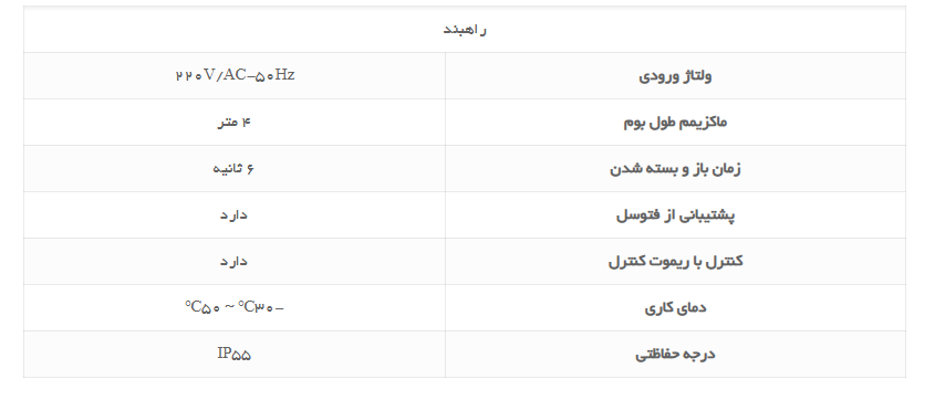 - بدنه و بوم راهبند از مواد با کیفیت و مقاوم در برابر شرایط جوی مختلف ساخته می شود که طول عمر بالایی را تضمین میکند.