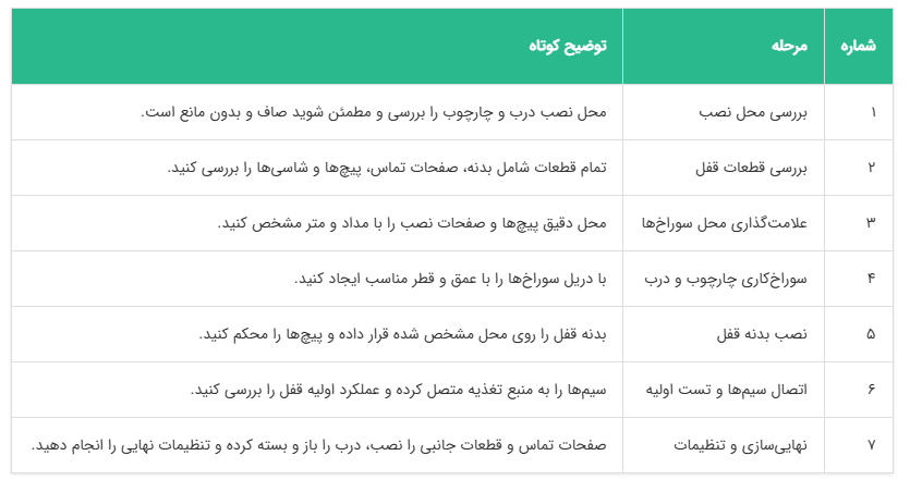 با رعایت این مراحل، قفل مقابل برقی بهدرستی نصب شده و امنیت و کارایی بالایی خواهد داشت. نصب دقیق باعث میشود قفل بدون گیر و صدای اضافی کار کند و تجربهای راحت و ایمن در استفاده روزمره ایجاد شود.